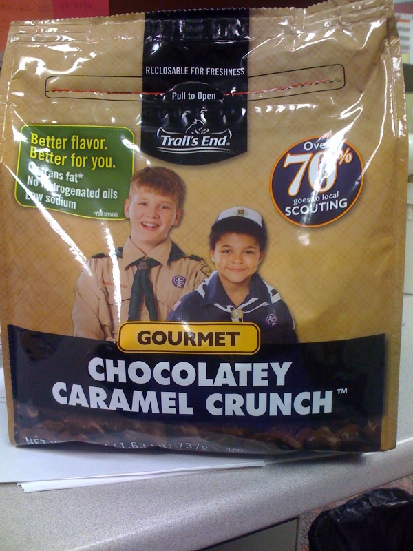 I just opened a bag of Chocolatey Caramel Crunch Boy Scouts popcorn.