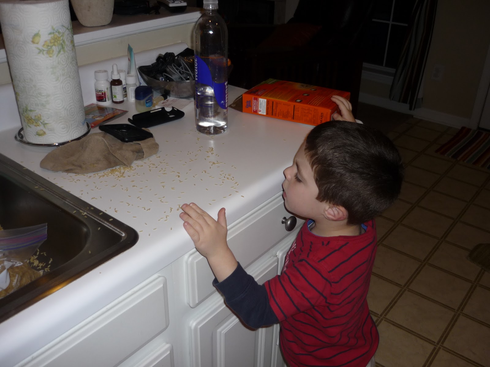 Unfortunately, more rice got outside of the bag than inside of it. You may be wondering how THAT happened. Well, I was crying. And the baby was crying. So it just happened.