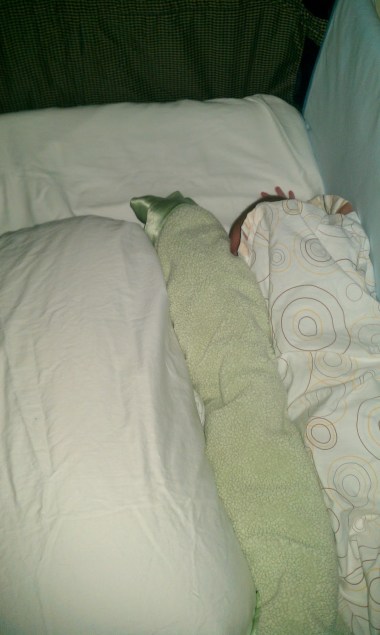 As shown in this photo, this morning I attempted to wedge my son between the wall of his Pack N’ Play and a rolled up blanket … and when that proved to not be enough of a barrier (he shoved it out of the way like it was nothing), I added in a pillow from my bed.