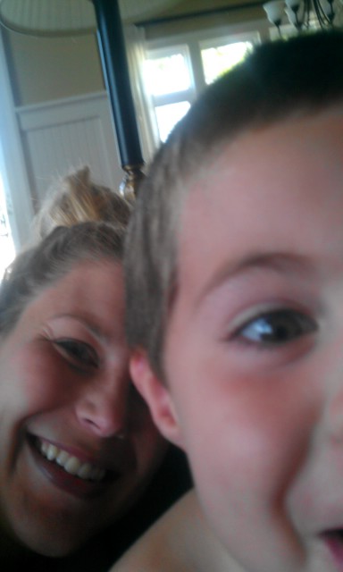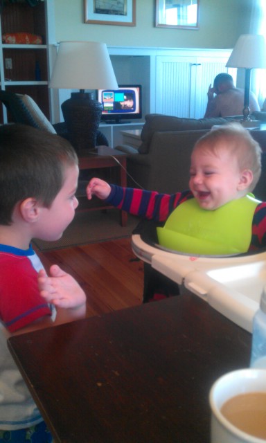| This picture speaks a thousand words. The laughter, the coffee in the foreground … the shirtless man in the background with his head in his hands. He’s going to kill me when he sees this. |