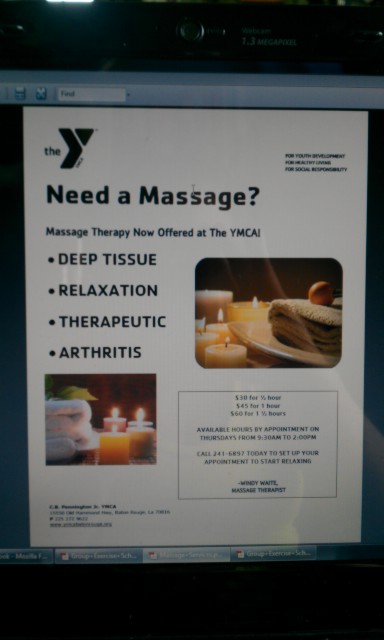 Once I was back home and finally got the baby to sleep I was looking at the website and made a discovery that literally caused me to gasp and clap my hand over my mouth: there’s a masseuse at the gym here.