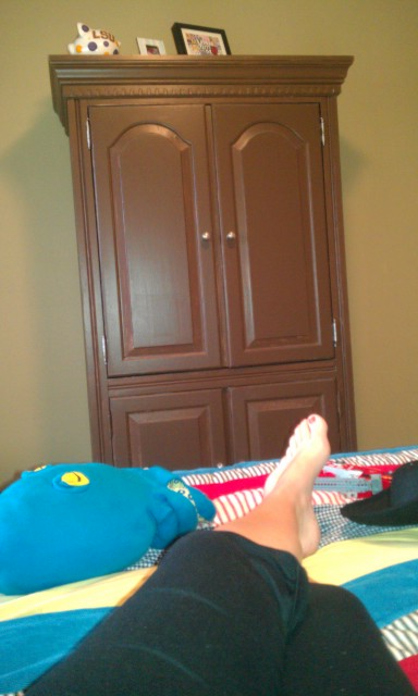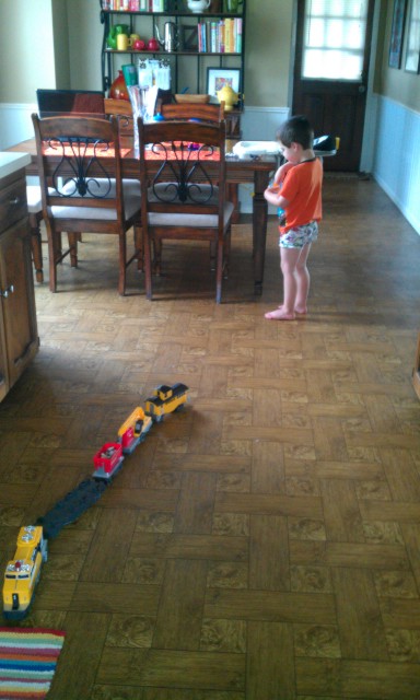 SECOND: today I have terrible cramps. So what did I do? I set up camp in ONE’s room and drank chocolate milk while he played with his train set. Now this is a nice way to spend a morning.