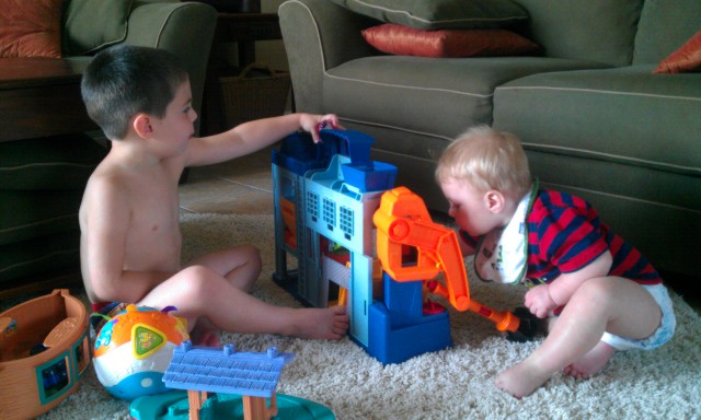 ONE and TWO are playing together. I mean, sort of. Like I can’t leave the room, but I can sit at the dining room table and watch them. And so far no blood has been shed.