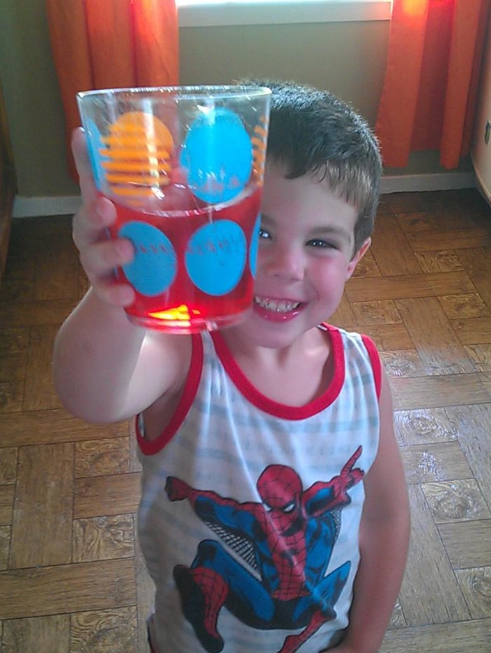 It’s been the perfect summer day, and we’re topping it off with Kool-Aid. That sugar/dye concoction has never made its way into my kitchen until now … but I figured he’ll be 4 in a few weeks, and it’s time for him to experience that part of childhood.