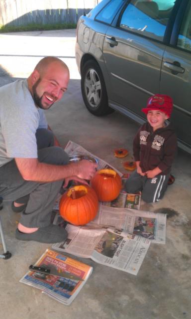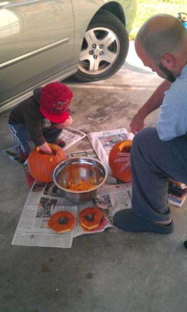 Yesterday, Husband and ONE carved pumpkins. Here they are, hard at work.
