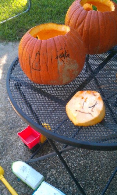 Apparently, Husband used a permanent marker to trace the faces and he forgot to bring it inside when they cleaned up. He DID, however, remember to bring in the knives and sharp tools that they were carving with … so kudos to him for that.