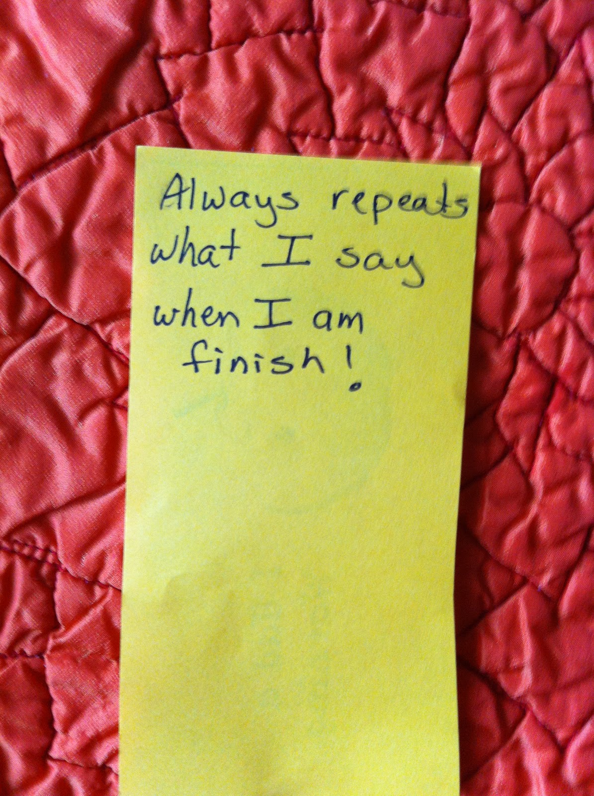And … the “disappointment.” He got in trouble repeatedly for copycatting what his teacher said. Like when she said “Get out your scissors,” ONE said “Get out your scissors.” I know this is super immature but something about that is so funny.