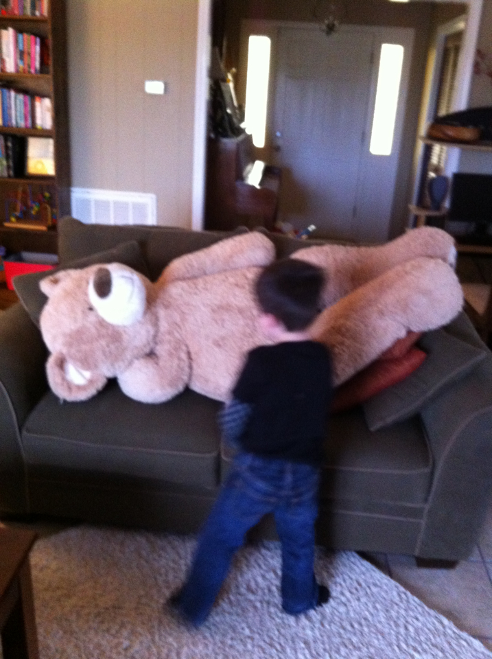 Today we brought a new friend home from Grandma’s house. Meet “Big Bro,” the biggest stuffed bear I’ve ever seen in my life. ONE is very attached to him, he hauls him all over the house and conversates with him as if he’s an actual person. Which is kind of understandable since he’s as large as an actual person.