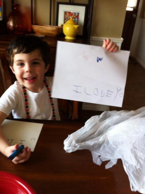 Anway, he asked me how to write I love you and rather than repeat “I-L-O-V … no, I said ‘I,’ yes, now write an ‘L’ … ” in a painstaking manner, I just wrote it down for him on a scrap of paper as a reference.