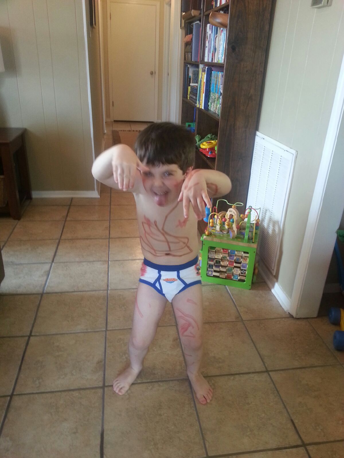 In case you can’t make out that picture very well, here’s a bigger version. He wanted to be a “zombie,” you see.