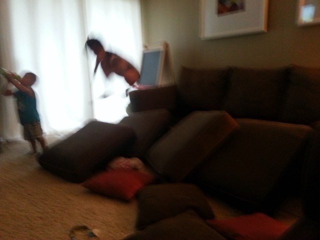 I’m always looking for new and easy ways to entertain my children. My friend Lila mentioned several months ago that her kids like to take the cushions off the couches and make forts with them. At the time, I remember thinking that there is no way in hell that would work in my house. I’d never tried it, but I just knew. Kind of like how I know that if I buy Asher his own little potty to pee and poop in, it would be a gigantic, pee-filled, mistake. I don’t have concrete reasons to back this up. I just have a gut-wrenching reaction of “NO!!!!!!!” when I think about it.
